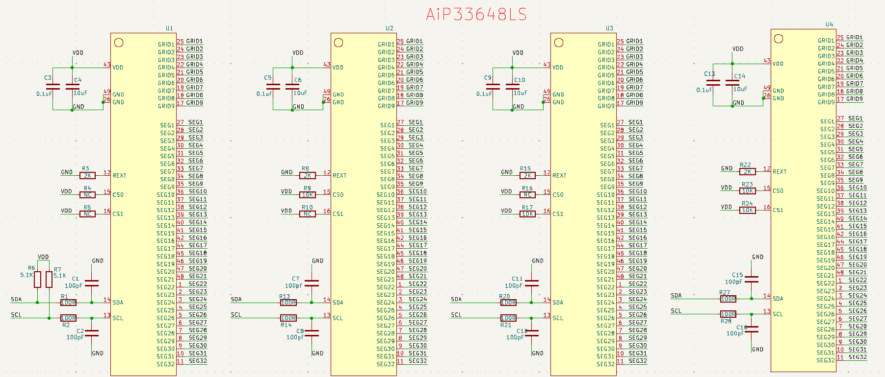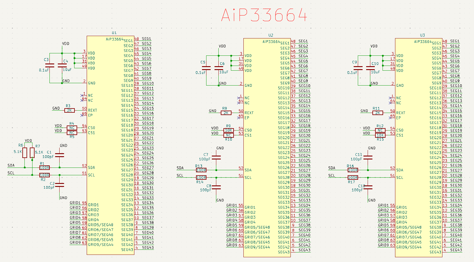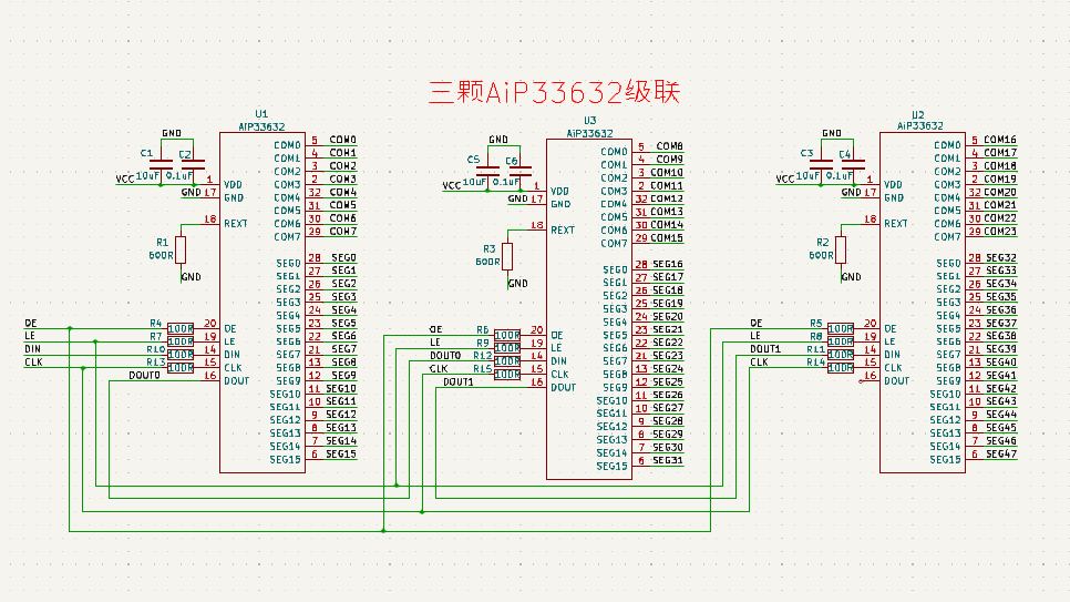 1)實現(xiàn)方式:三顆AiP33632級聯(lián),共有24個COM、48個SEG,可驅(qū)動控制24*48=1152顆LED燈。原理圖設(shè)計見圖1。