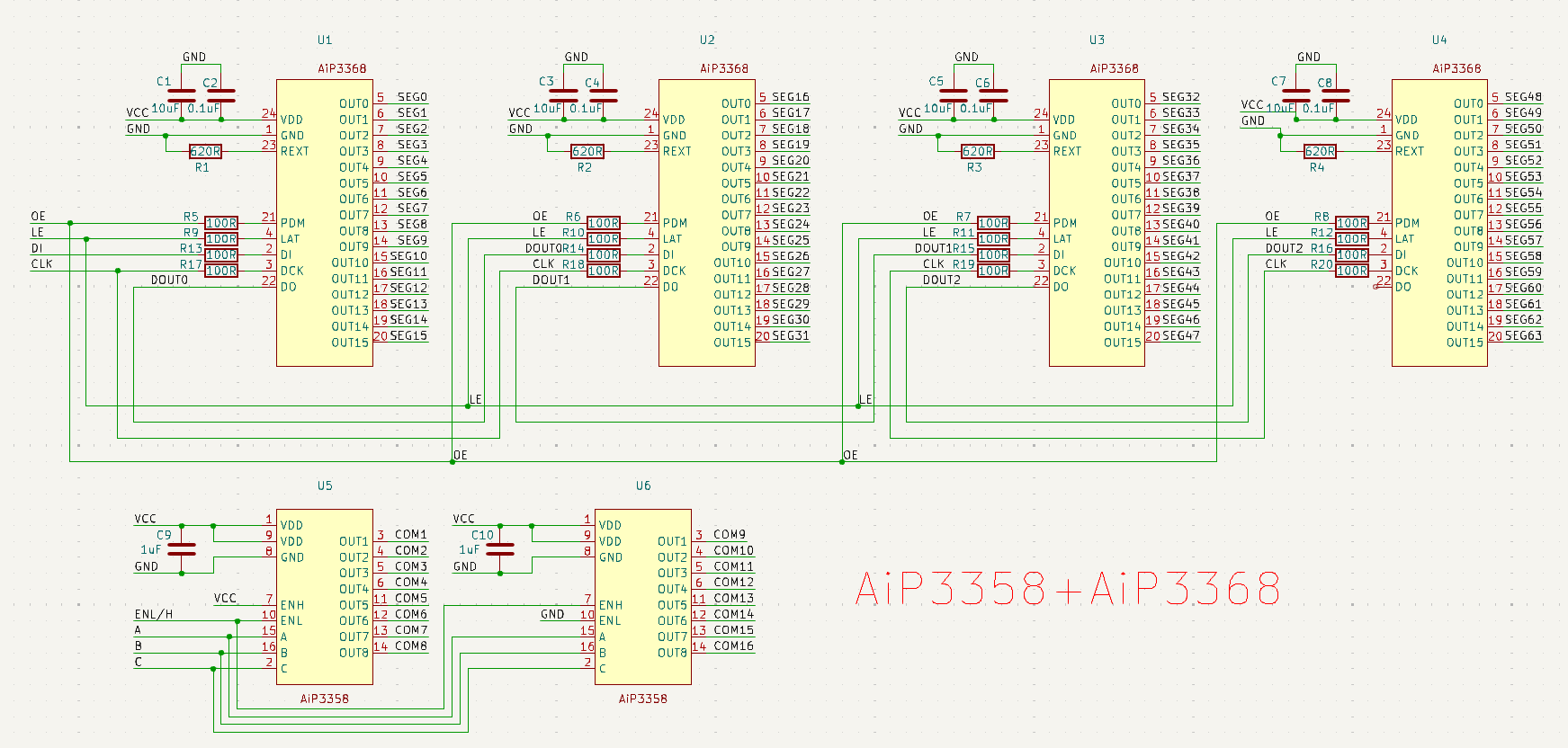 1)實現(xiàn)方式:兩顆AiP3358級聯(lián)作為COM陽極行驅(qū)動,四顆AiP3368級聯(lián)作為SEG陰極列驅(qū)動,共有16個COM、64個SEG,可驅(qū)動控制16*64=1024顆LED燈,原理圖設(shè)計見圖3。