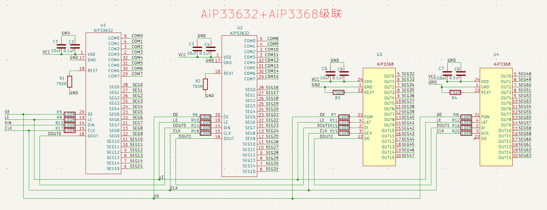1)實現(xiàn)方式:兩顆AiP33632級聯(lián)+兩顆AiP3368,共有16個COM、64個SEG,可驅(qū)動控制16*64=1024顆LED燈,原理圖設(shè)計見圖2。