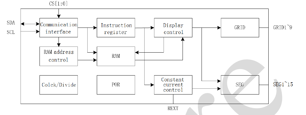 驅(qū)動(dòng)點(diǎn)陣大?。鹤畲? GRID×15 SEG,共陰極LED點(diǎn)陣,GRID數(shù)可選