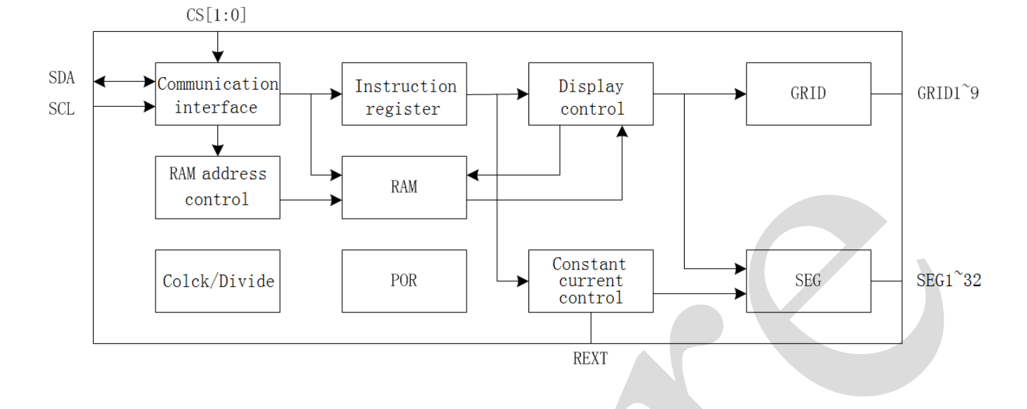 驅(qū)動點(diǎn)陣大小:最大9 GRID×32 SEG,共陰極LED點(diǎn)陣,GRID數(shù)可選