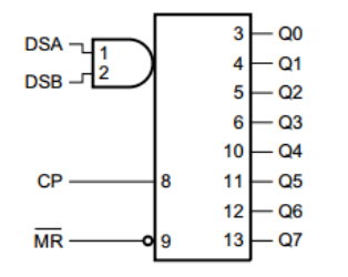 The AiP74HC/HCT164 is an 8-bit serial-in/parallel-out shift register. The device features two serial data inputs (DSA and DSB), eight parallel data outputs (Q0 to Q7). Data is entered serially through DSA or DSB and either input can be used as an active HIGH enable for data entry through the other input. Data is shifted on the LOW-to-HIGH transitions of the clock (CP) input. A LOW on the master reset input (MR) clears the register and forces all outputs LOW, independently of other inputs. Inputs include clamp diodes. This enables the use of current limiting resistors to interface inputs to voltages in excess of VCC.
