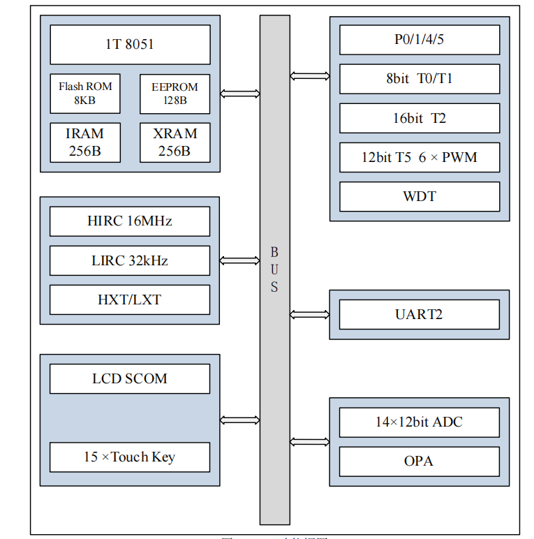 定時器:兩個 8 位通用定時器 T0/1、一個 16 位通用定時器 T2、一個 12 位高級定時器 T5、一個 8 位看門狗 WDT