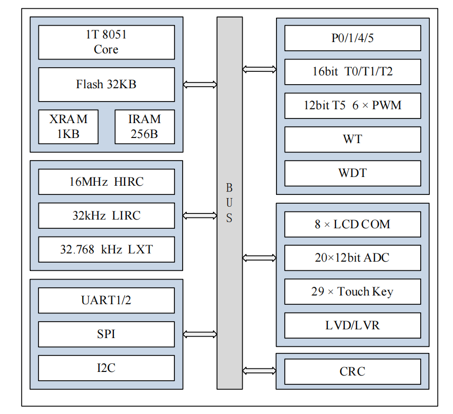 顯示驅(qū)動(dòng)模塊:LCD 驅(qū)動(dòng)、支持 8 COM、支持 1/2 偏置